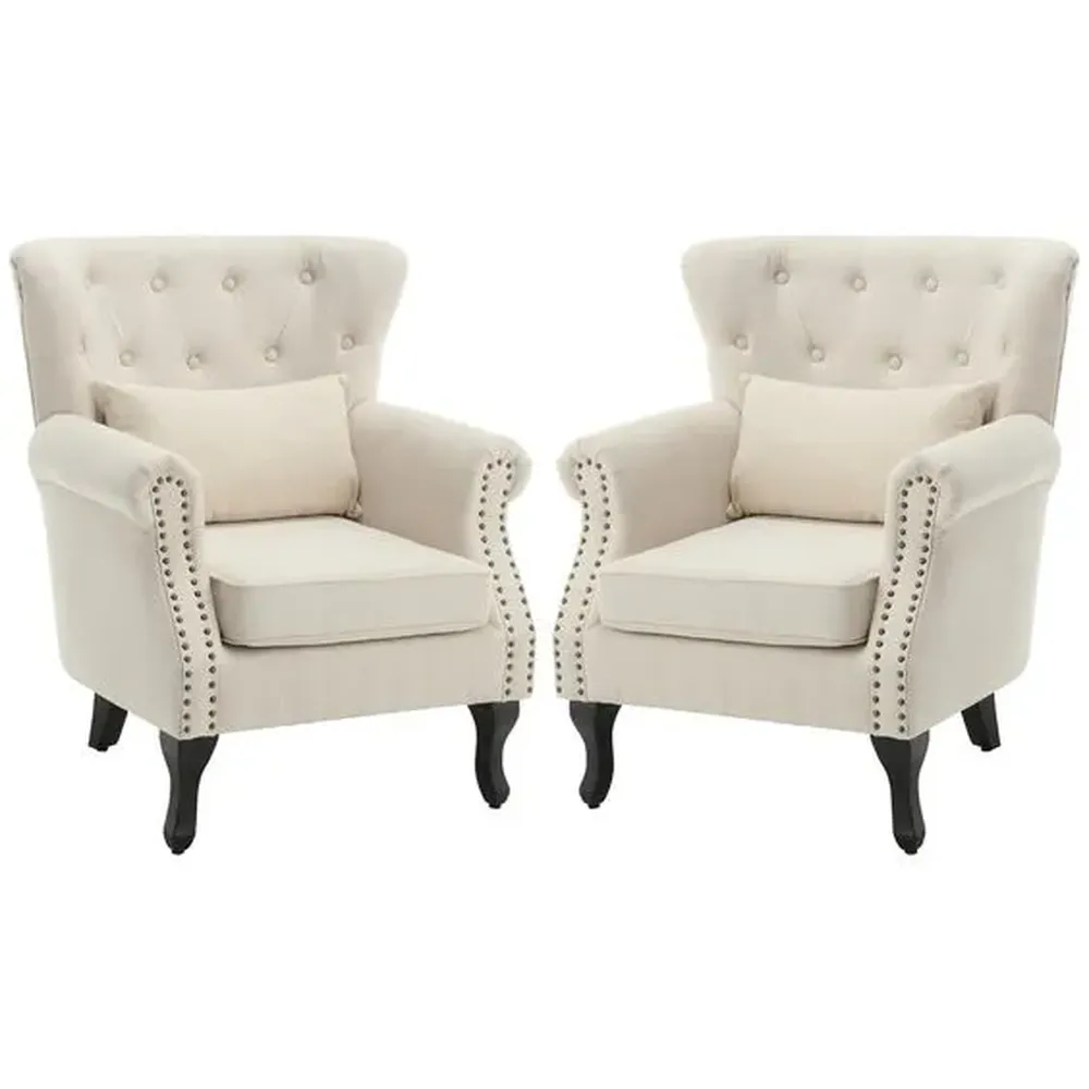Pair of Classic Tufted Wingback Bedroom Chairs in White Velvet