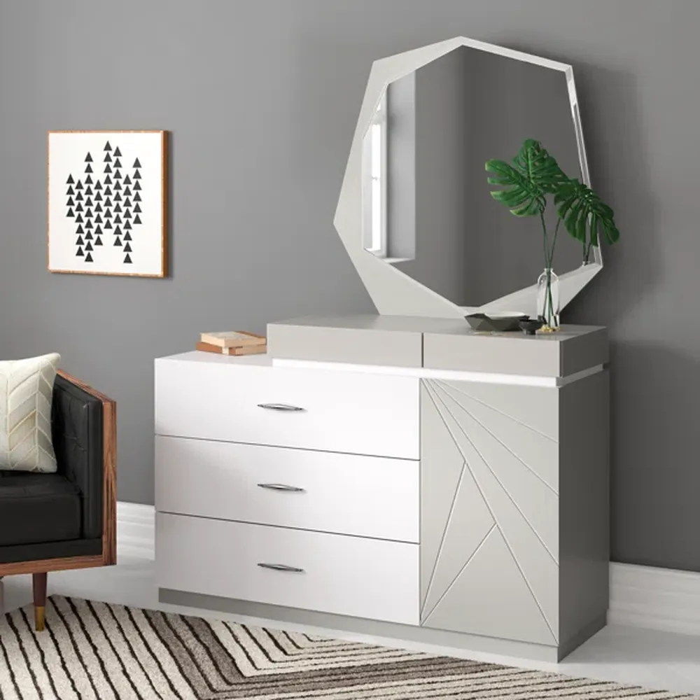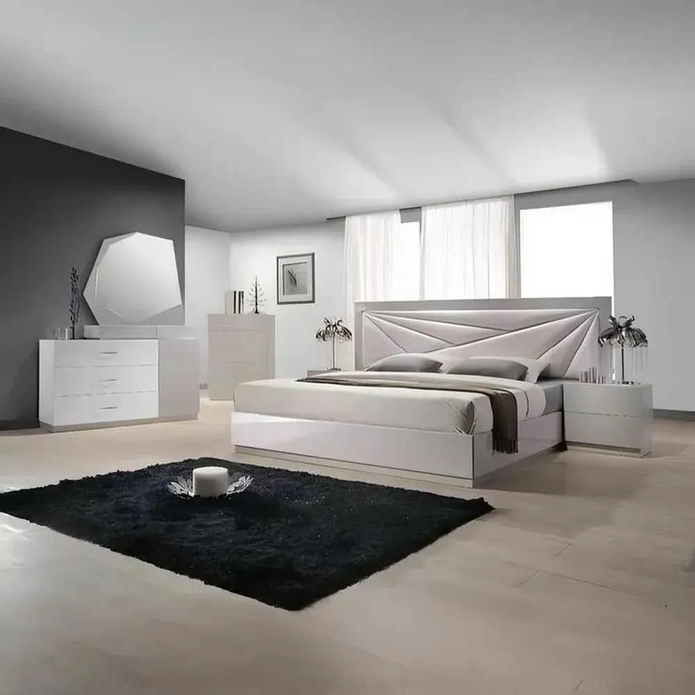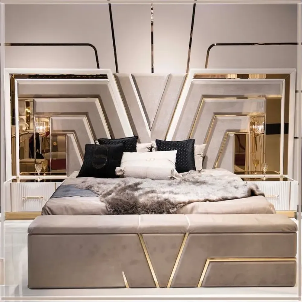Avant-Garde Grey and White Geometric Fabric Bed with Gold Inlays