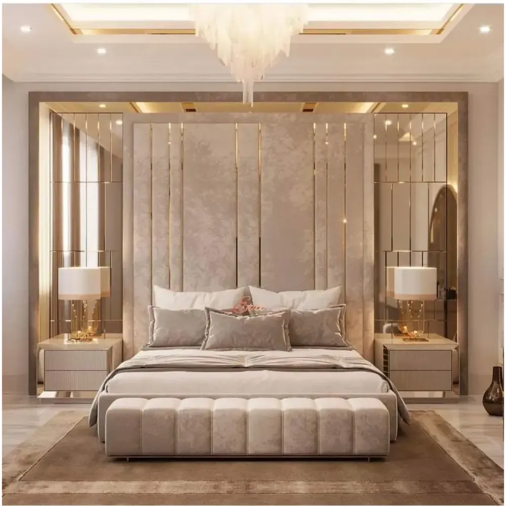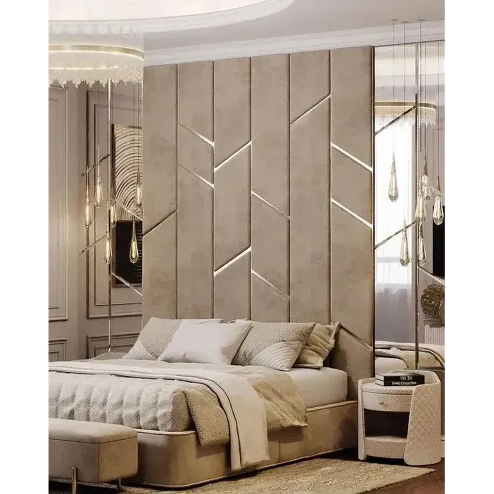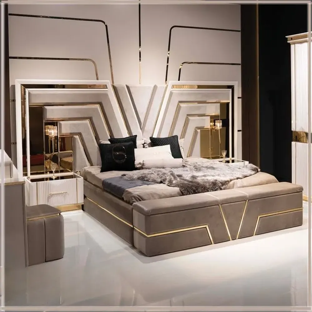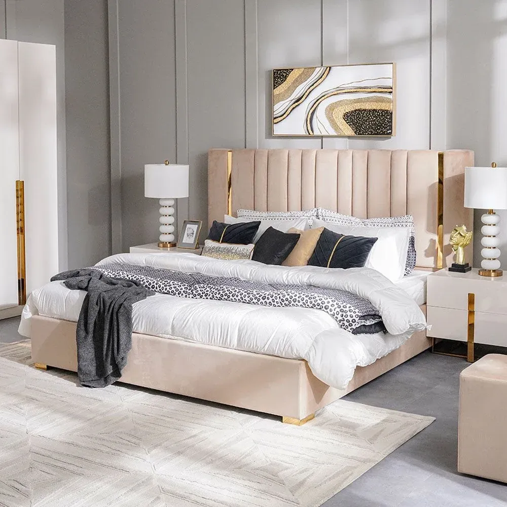 Beige Velvet Vertical Tufted Bed with Gold Trim and Marble Accents