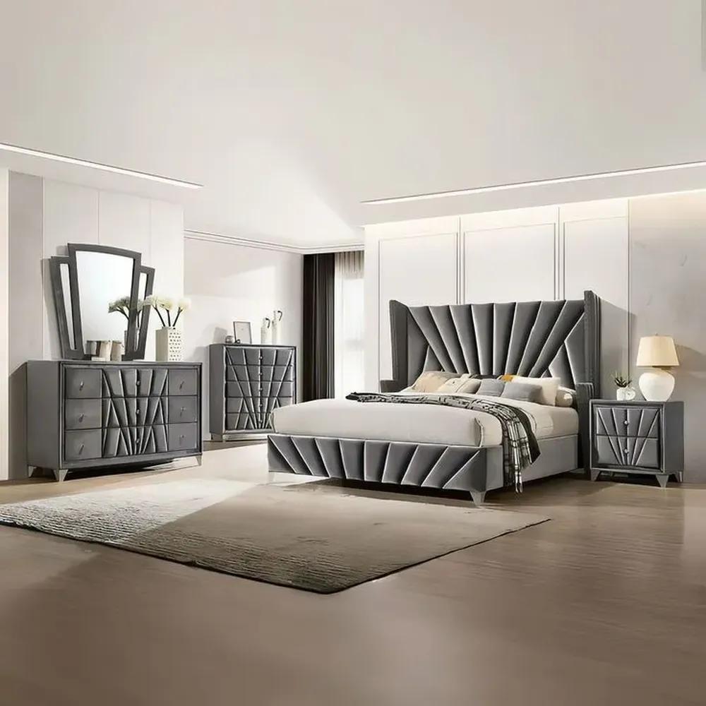 Art Deco Inspired Grey Velvet Bedroom Set with Geometric Sunburst Headboard