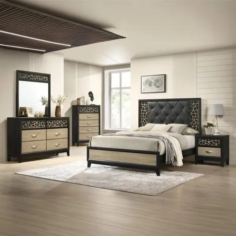 Classic Black and Beige Tufted Bedroom Set with Intricate Lattice Work