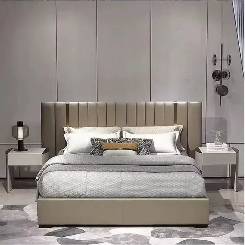 Beige Velvet Vertical Tufted Bed with Gold Trim and Marble Accents