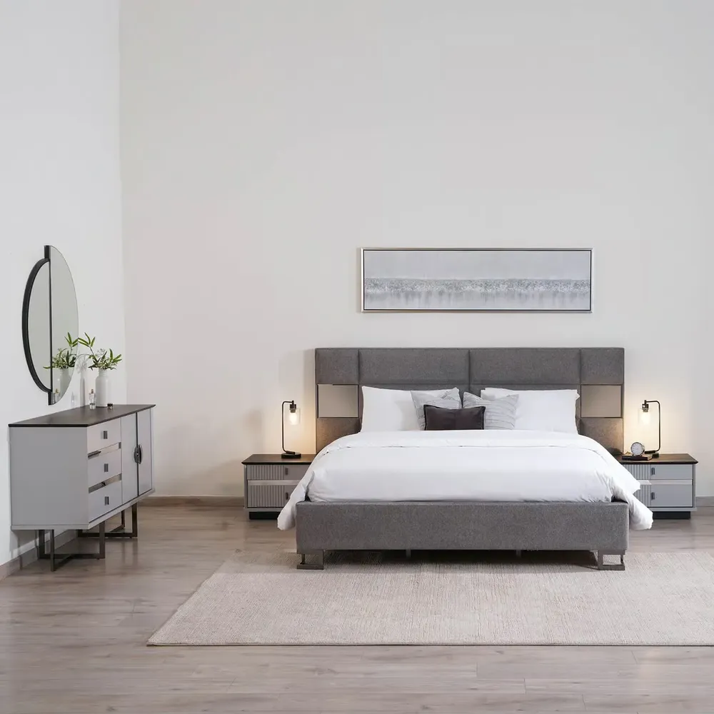 Grey Velvet Turkish Fabric Bed with Integrated Side Mirrors
