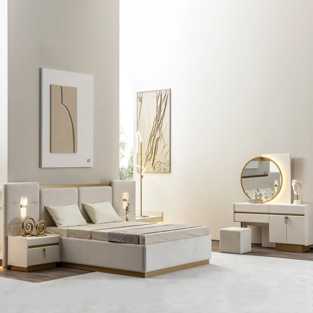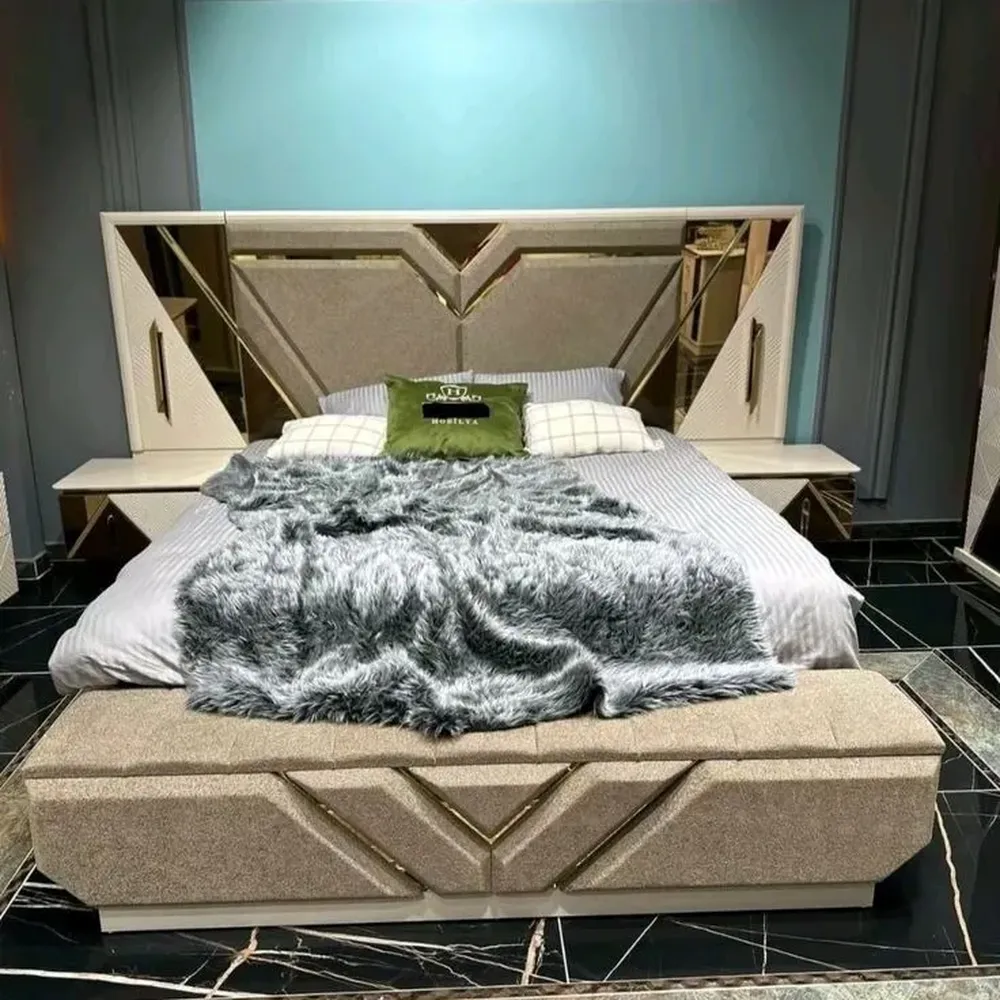 Luxury Turkish Grey Fabric Bed with Mirror Border Headboard