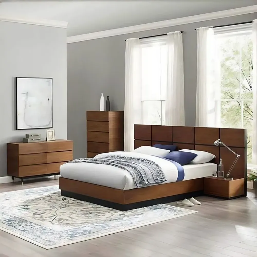 Mid-Century Modern Light Brown Wood Bed with Grid Headboard
