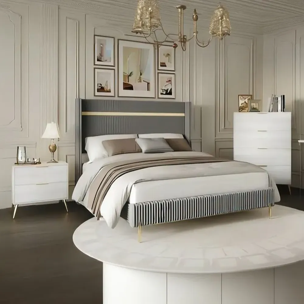 Elegant Turkish Velvet Bed with Fluted Grey Headboard and Pinstriped Base
