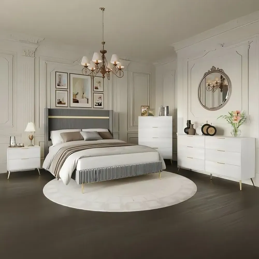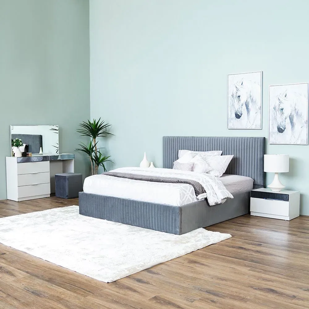 Elegant Grey Velvet Vertical Slat Bed with Matching Vanity Set