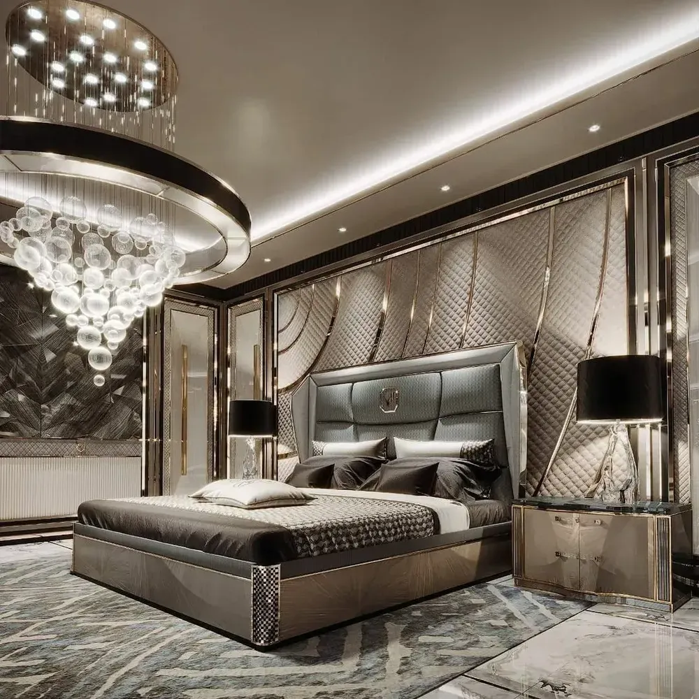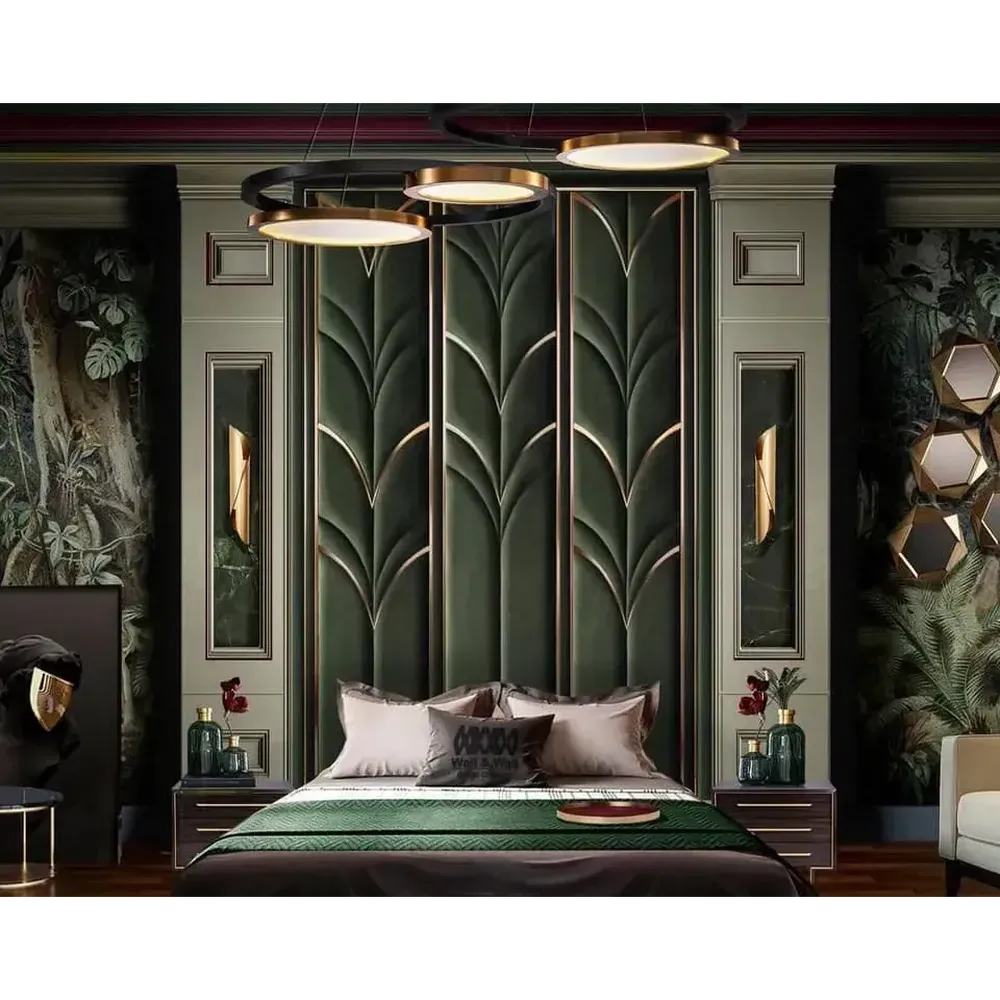 Grand Geometric Tufted Wall Bed with Integrated Floor-to-Ceiling Velvet Paneling