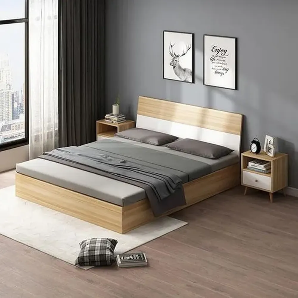 Modern Laminated Light Brown and White Platform Bed with Storage
