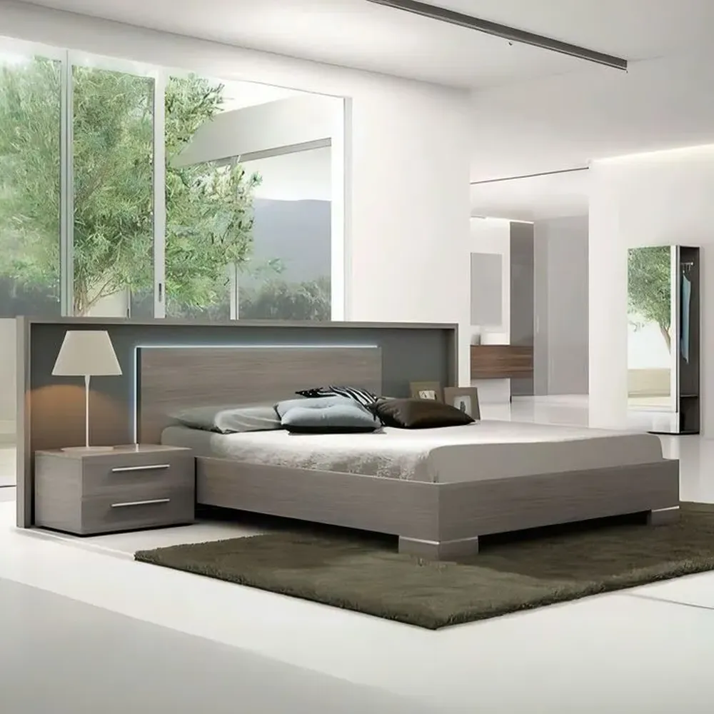 Modern Two-Tone Laminated Bed with Integrated LED Headboard