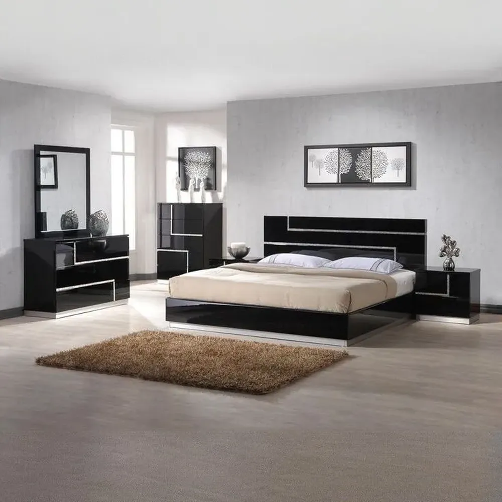 Sleek Black Deco Modern Bed Set with Silver Chrome Geometric Accents
