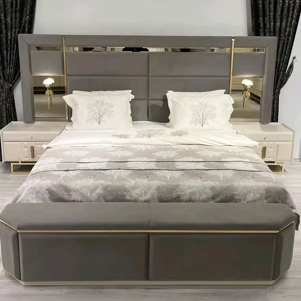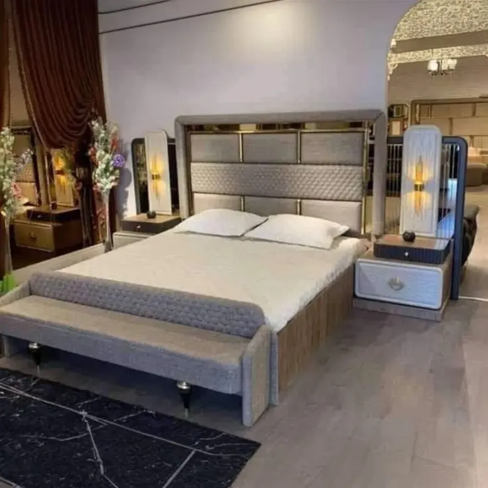 Turkish Luxury Grey Velvet Bed with Gold Trim and Storage Bench