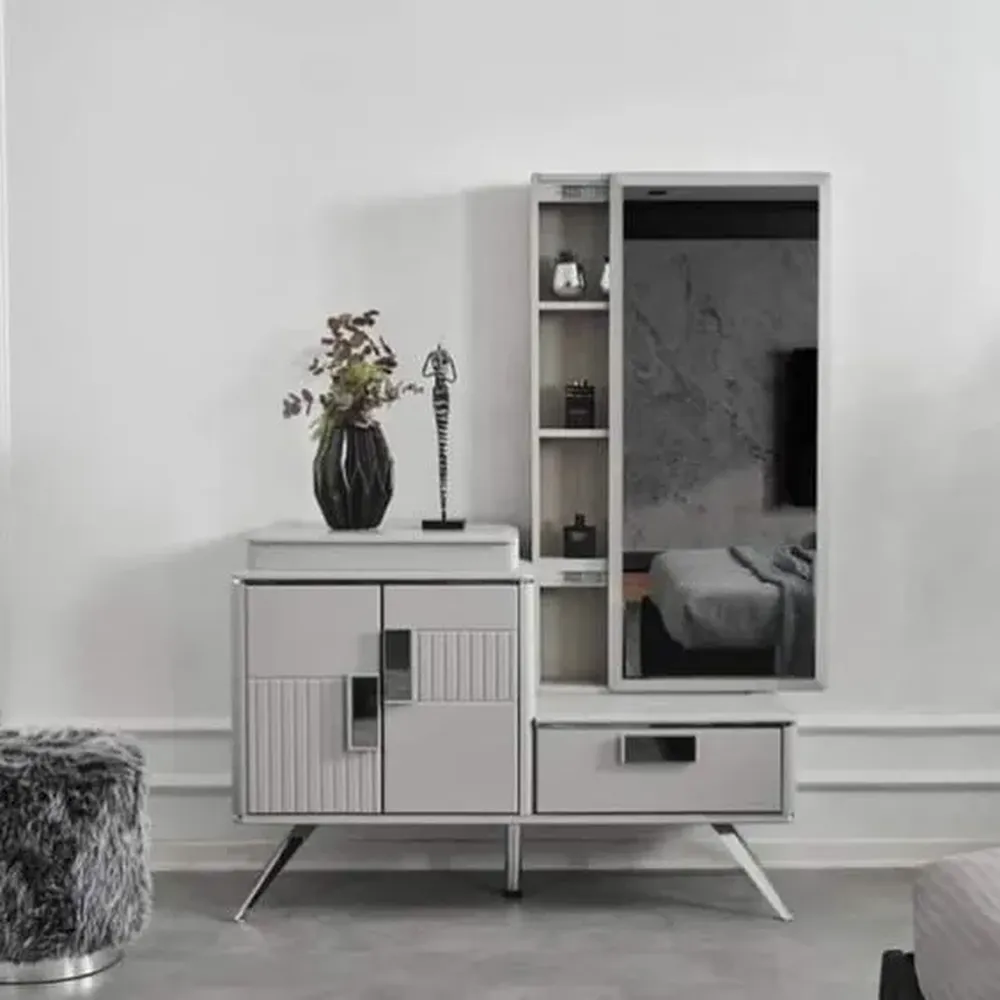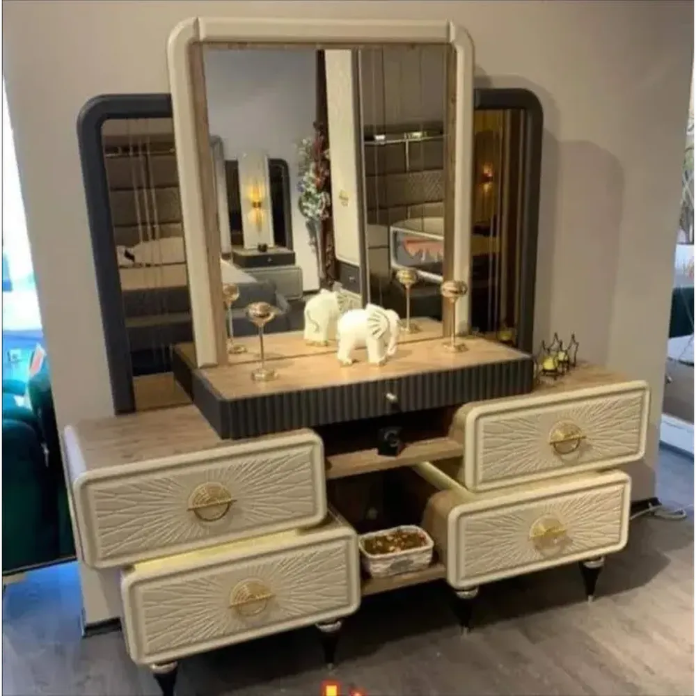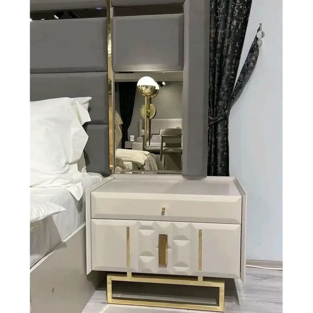 Turkish Modern Grey and White Upholstered Bed with Integrated Vanity Mirrors