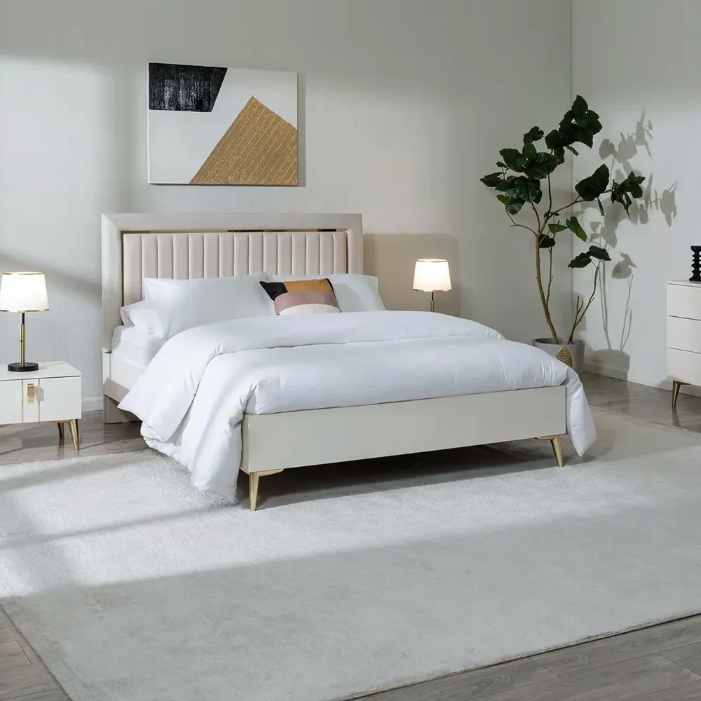 Turkish Style Beige Fabric Bed with Gold Inlay and Fluted Headboard