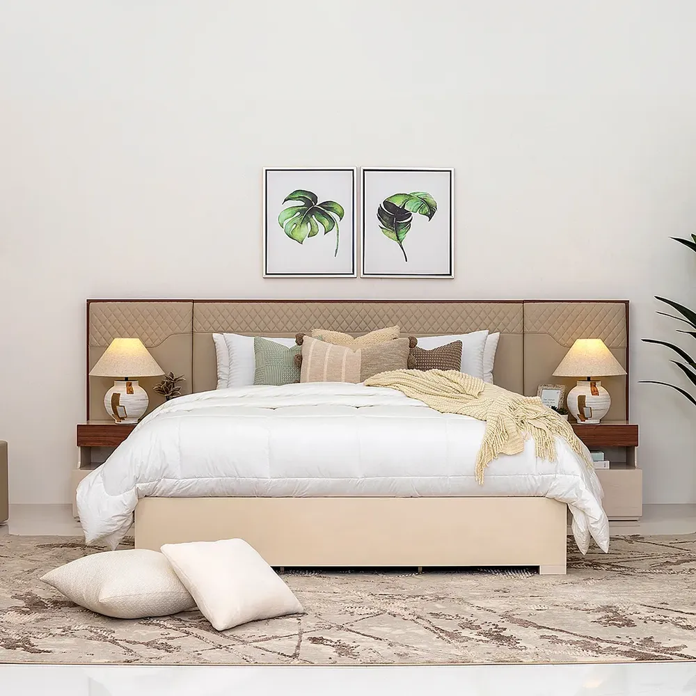 Turkish Beige Fabric Bed with Oversized Diamond Quilted Headboard