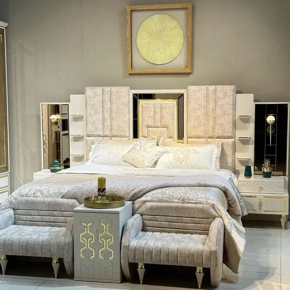 Turkish Style Grand Fabric Bed with Integrated Nightstands and Marble Backdrop