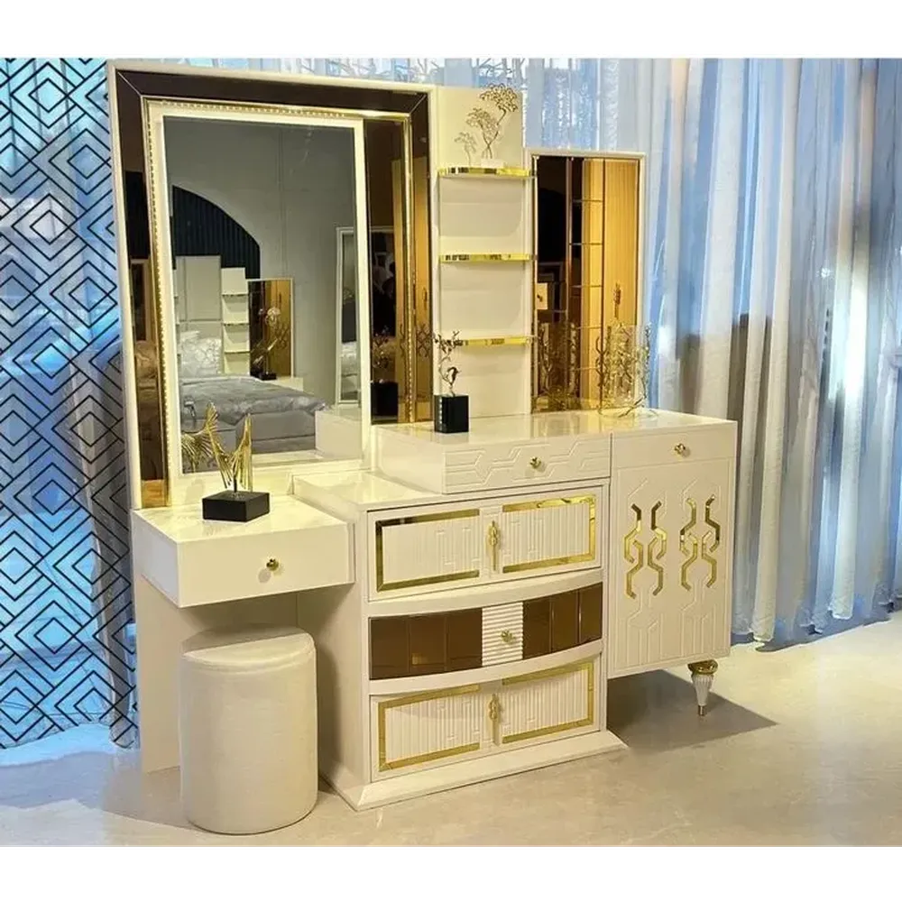 Turkish Style Grand Upholstered Wall Bed with Mirrored Side Panels and Gold Accents