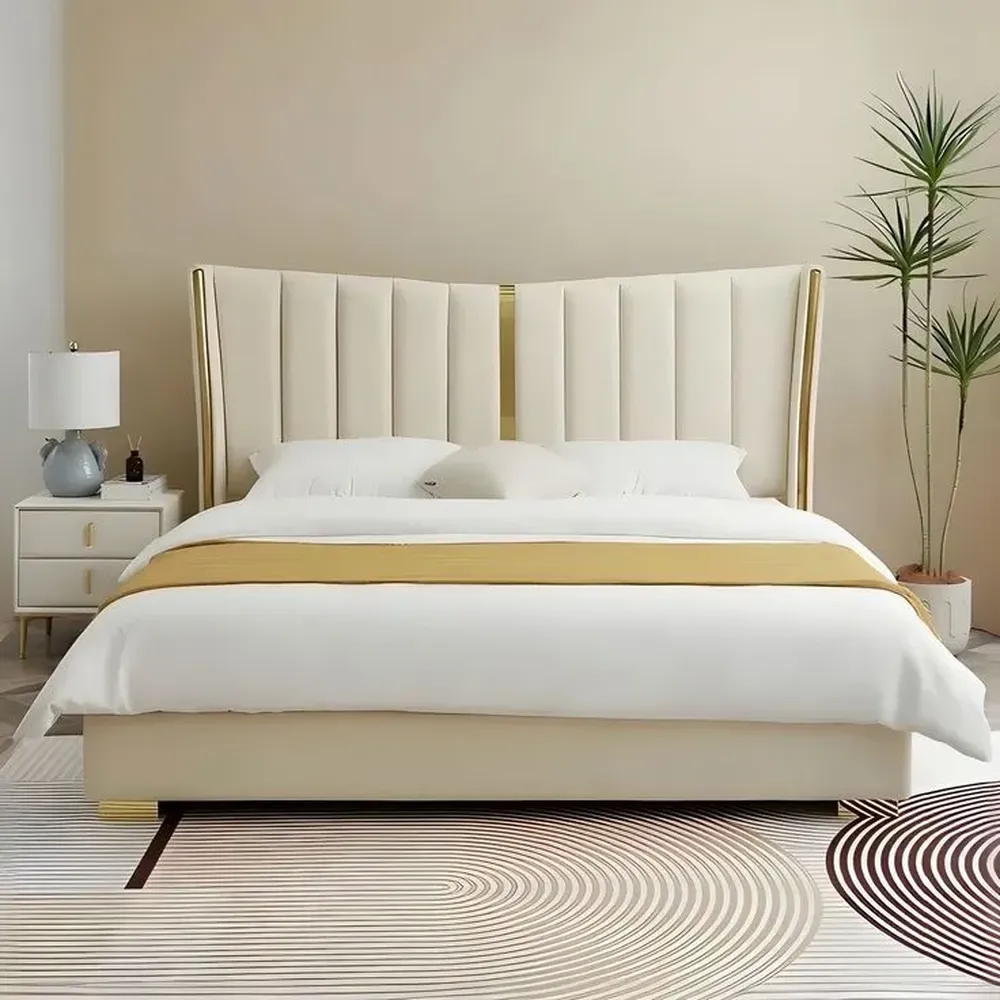 Turkish Style Cream Leatherette Bed with Gold Vertical Trim