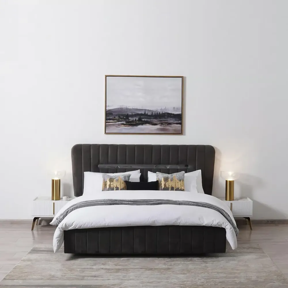 Turkish Style Ultra-Modern Charcoal Fabric Bed with Oversized Wingback Headboard