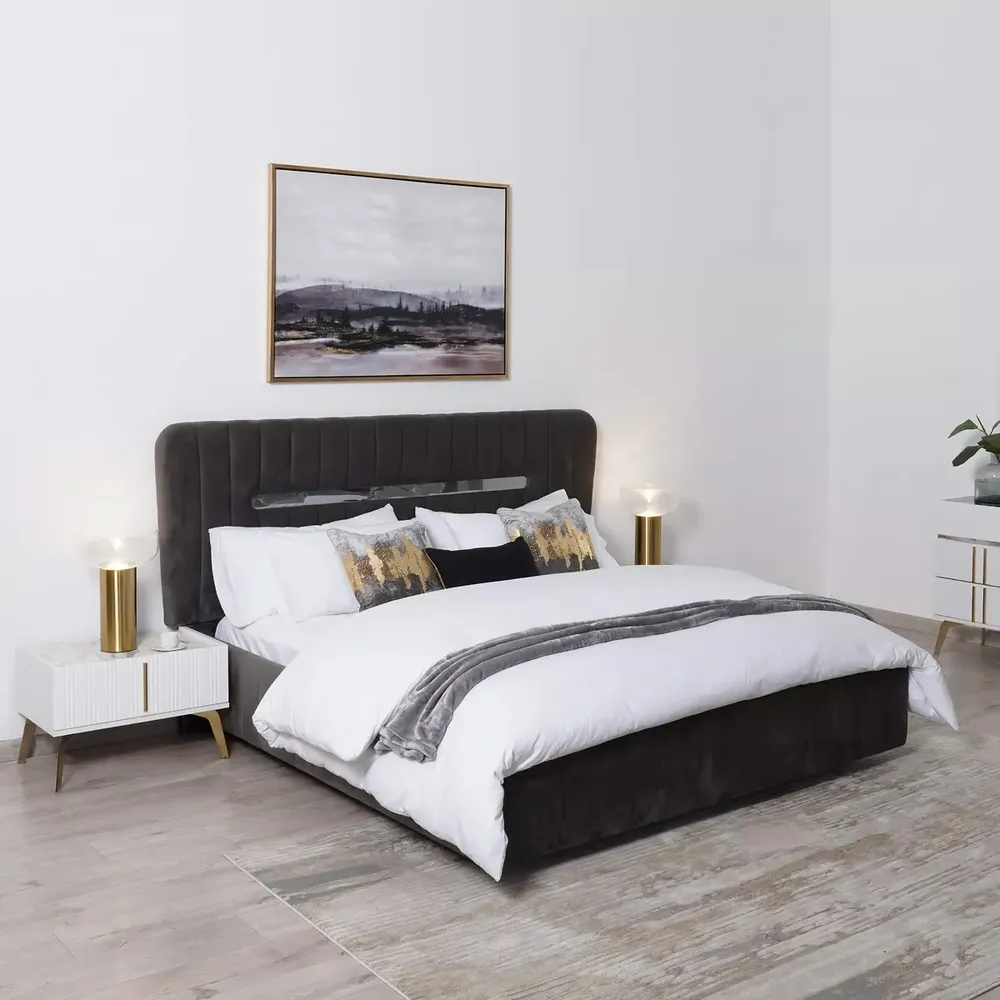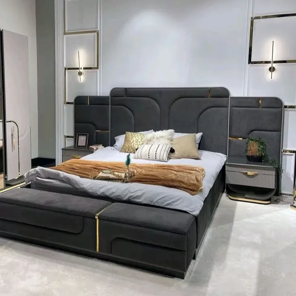 Turkish Style Luxury Fabric Bed with Mirrored Side Panels and Gold Emblems