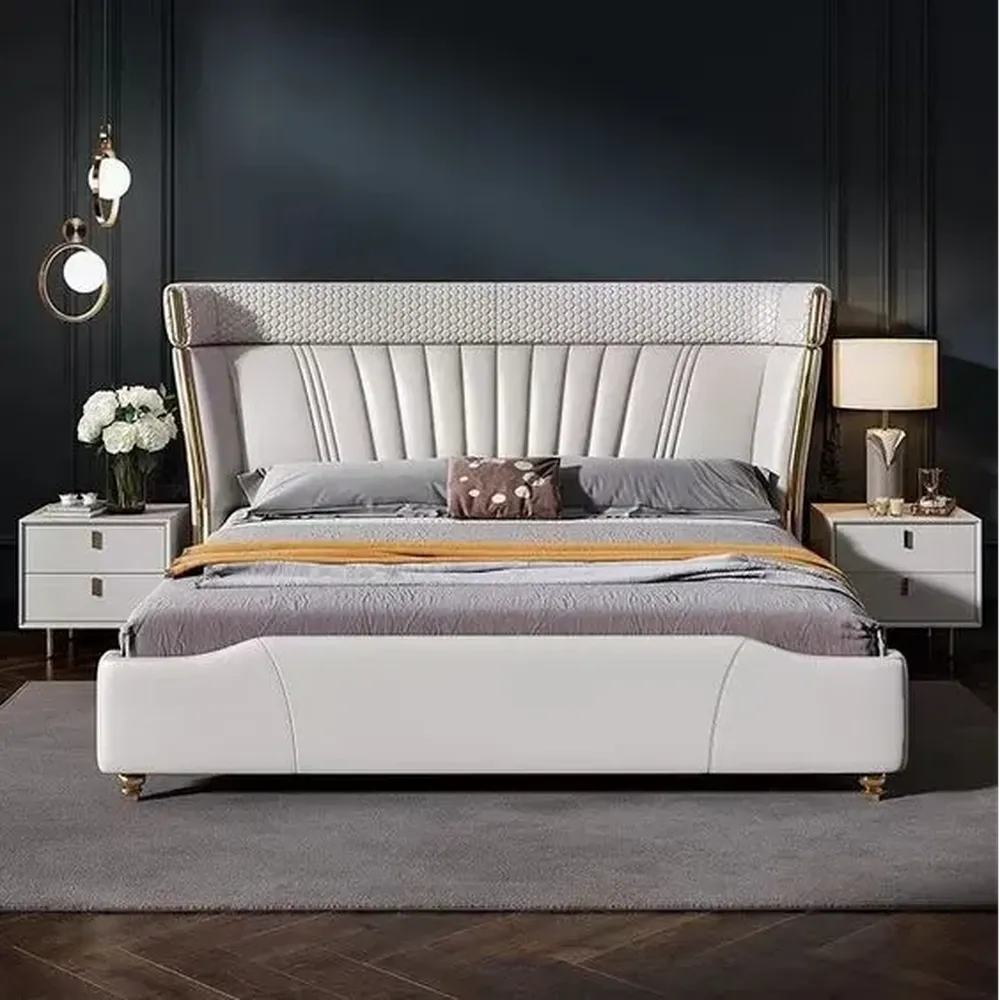 Turkish White Leather-Rite Wingback Bed with Gold Geometric Details