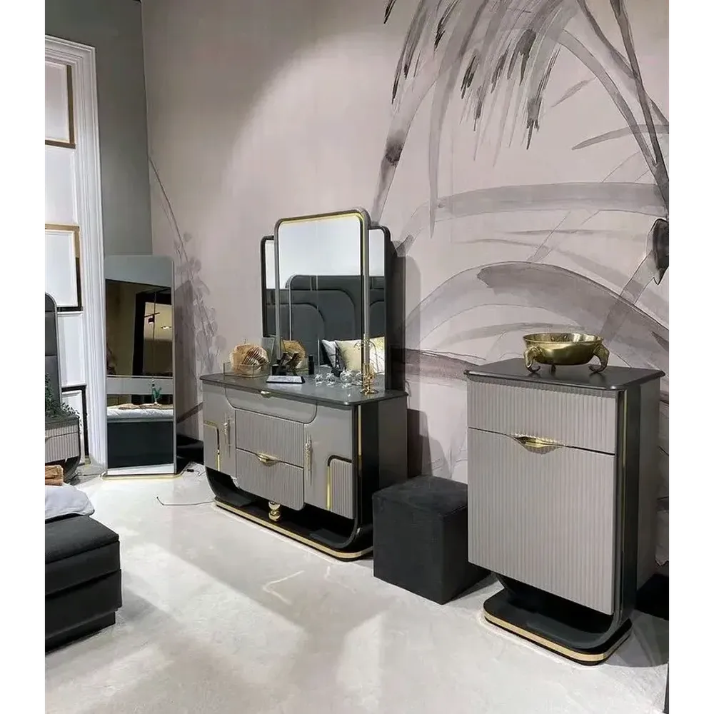 - Dual spacious drawers with elegant gold knob handles