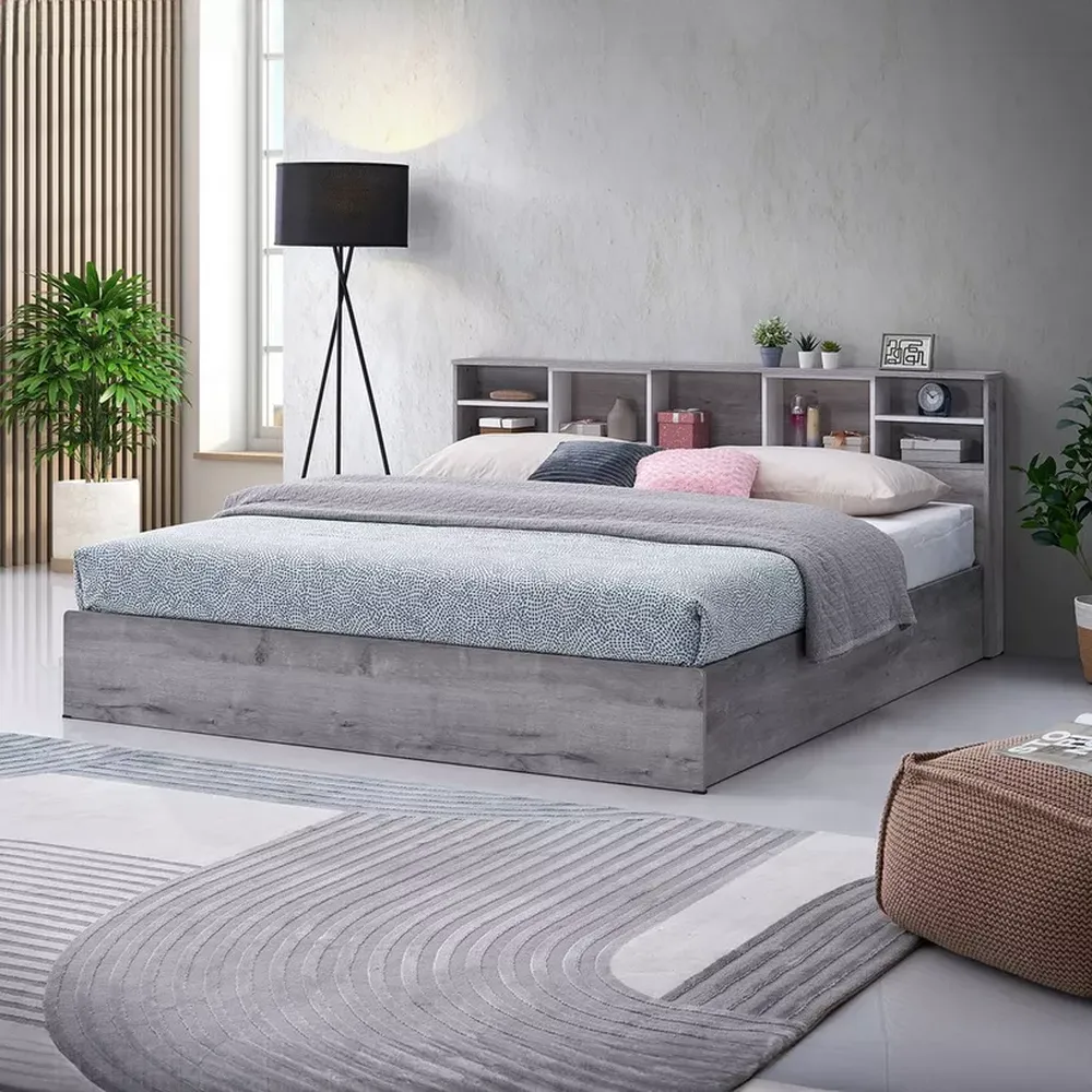 Urban Grey Laminated Platform Bed with Integrated Headboard Storage and LED Lighting