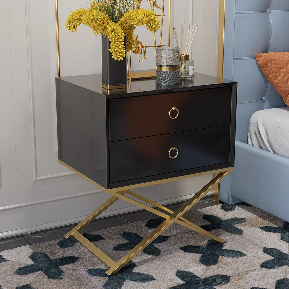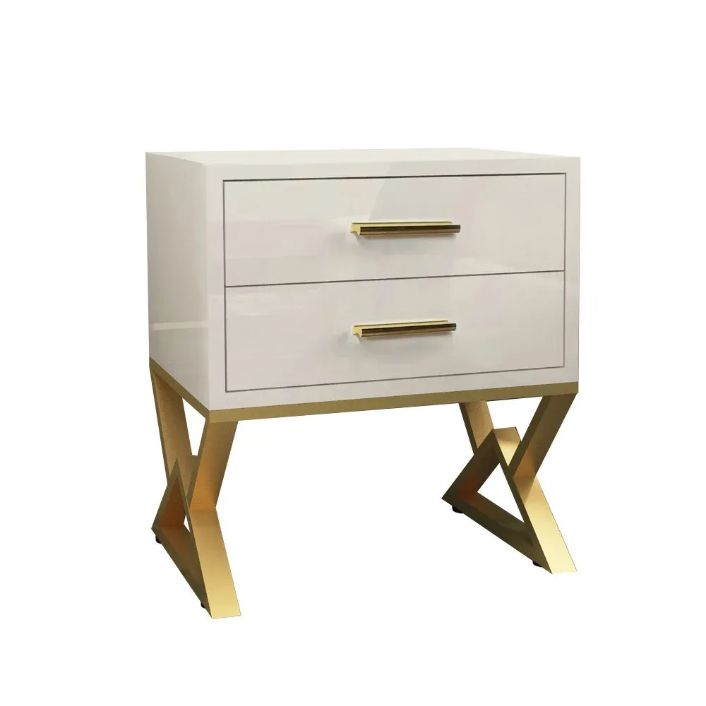 High Gloss White Side Table with Geometric Gold X-Base and Dual Storage Drawers