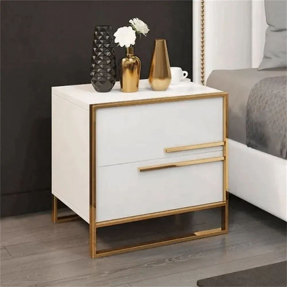 High-Gloss White and Gold Modern Nightstand with Curved Edges