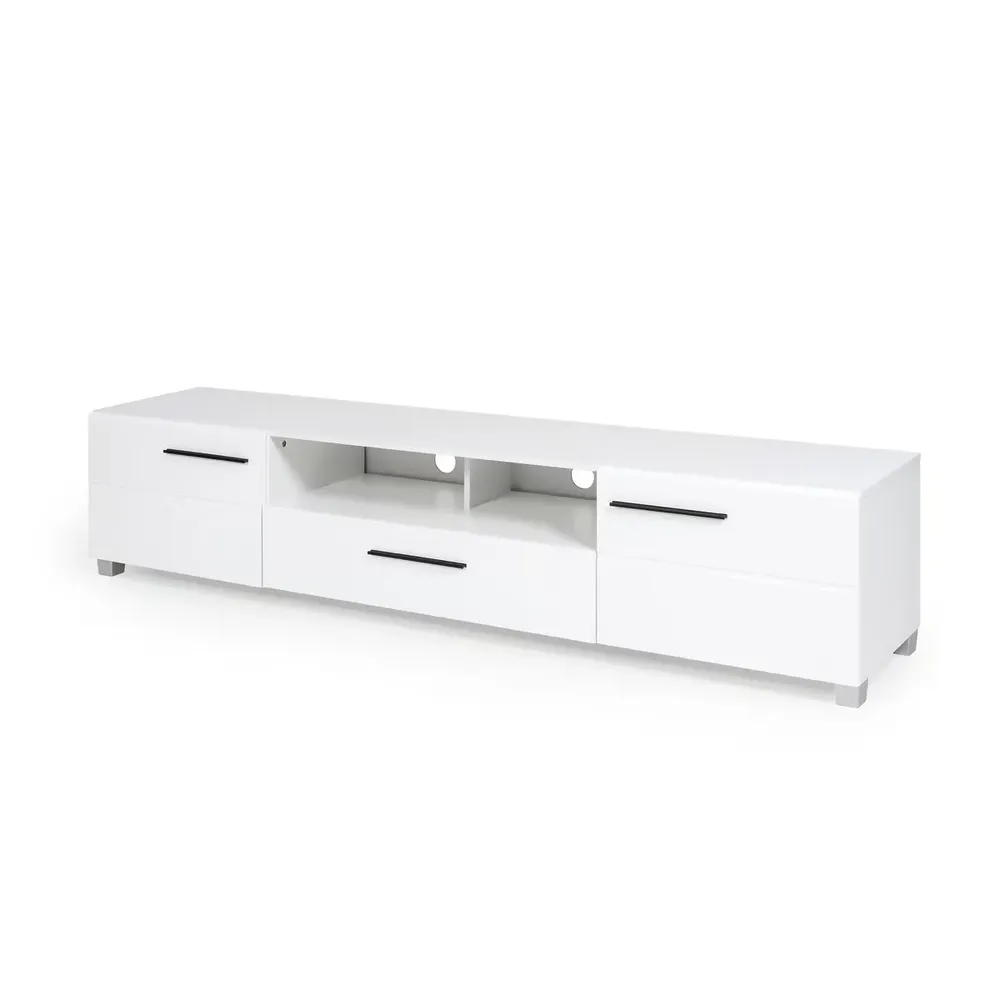 Minimalist Glossy White Floating Media Console with Marble Top and Slate Legs