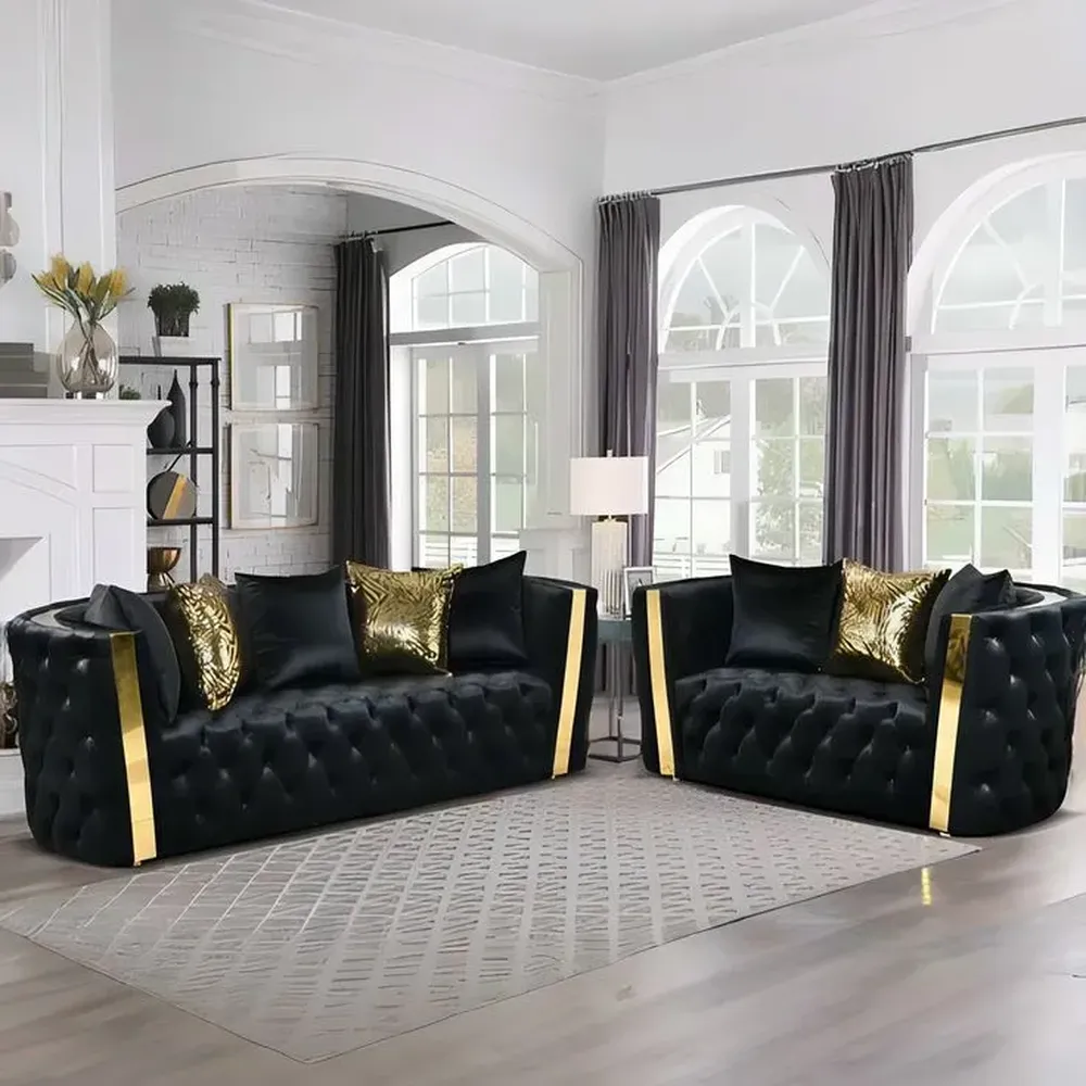 Luxury Turkish Style Tufted Velvet Sofa Set in Charcoal Black with Gold Accents