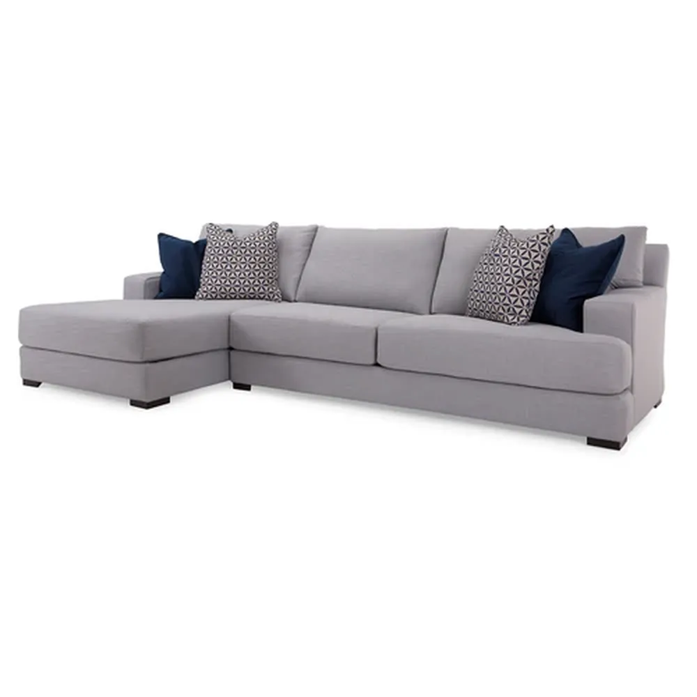 Modern Grey L-Shaped Sectional Sofa with Navy Blue Accent Pillows