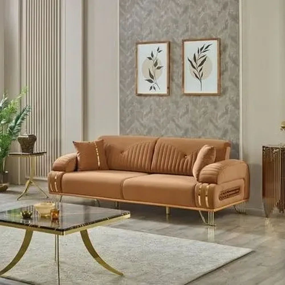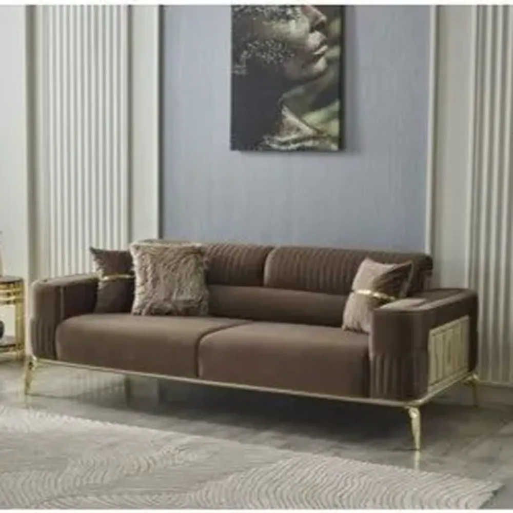 Luxury Turkish Brown Velvet Sofa with Gold Metal Trim and Fluted Backrest