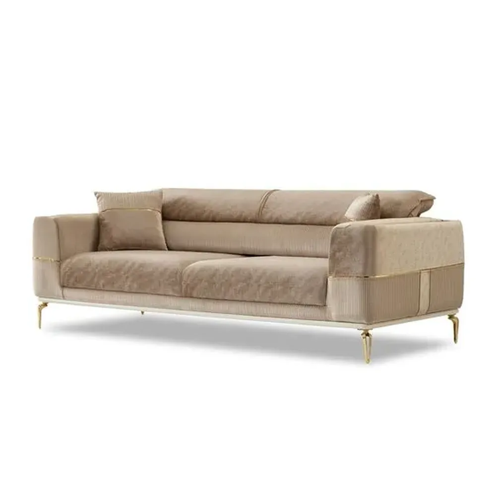 Luxury Turkish Beige Velvet Sofa Set with Vertical Channel Tufting and Gold Accents