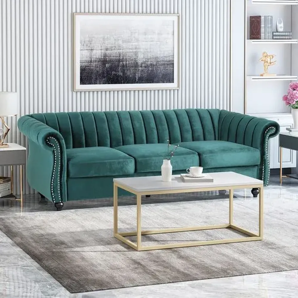 Luxury Grey Velvet Sofa with Gold Trim and Channel Tufted Arms