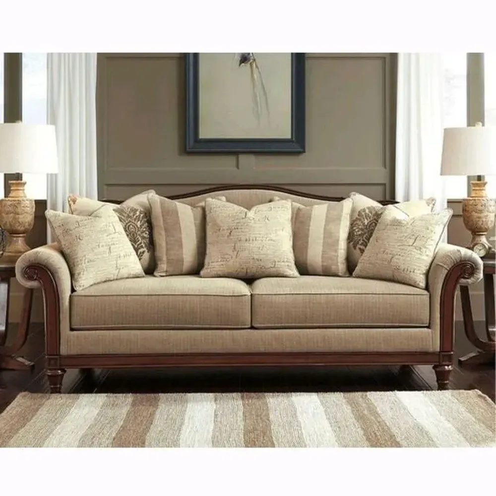 Classic Luxury White Fabric Wooden Sofa with Carved Dark Brown Frame
