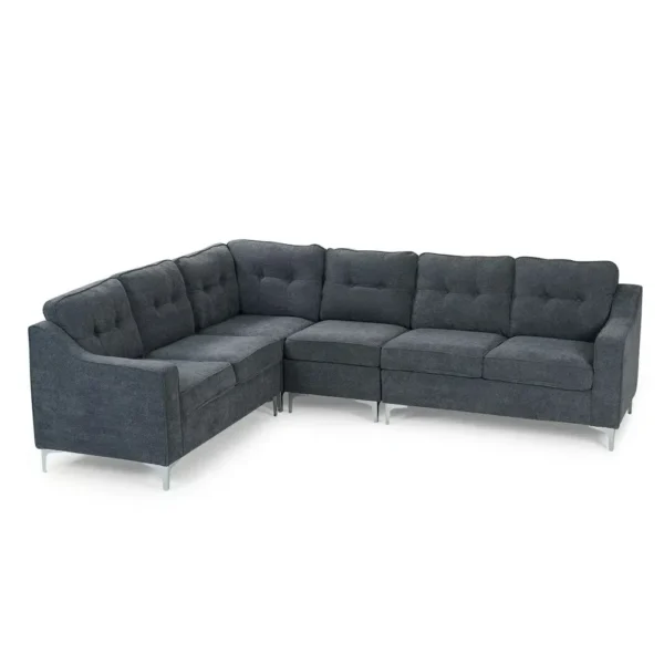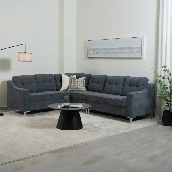 Maximize your seating and style with this spacious charcoal grey sectional. Designed for ultimate comfort, the sofa features button-tufted back cushions and a wide chaise lounge section. The low-profile design and polished silver legs give it a sleek, modern edge that fits perfectly into any contemporary living room layout.