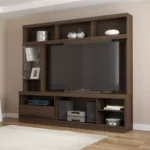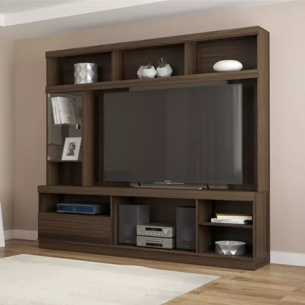 This grand media center offers an all-in-one solution for your home theater. With dedicated spaces for audio equipment, books, and decorative items, the deep polished wood grain adds a sense of warmth and permanence to your entertainment area.