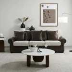 This classic living room set features a sturdy sofa upholstered in dark brown leather-rite with soft white fabric seating. The ensemble is paired with a heavy-duty round white marble coffee table, blending traditional comfort with high-end materials for a sophisticated look.