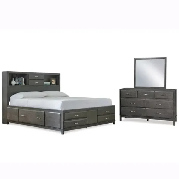 Maximize your bedroom storage without sacrificing style. This classic polish bed features a library-style headboard and deep under-bed drawers. The matching dresser ensures a cohesive, organized, and traditional look for any bedroom.