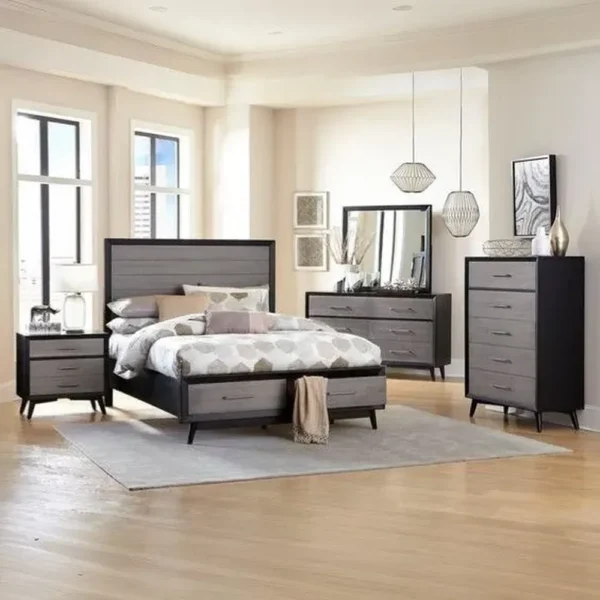 Bring a touch of classic sophistication to your room with this slat-style storage bed. The contrasting black frame and grey wood-grain panels offer a versatile look that fits any decor. Functional as it is beautiful, the footboard features two spacious drawers, while the matching chest and dresser provide a complete storage solution for a clutter-free space.