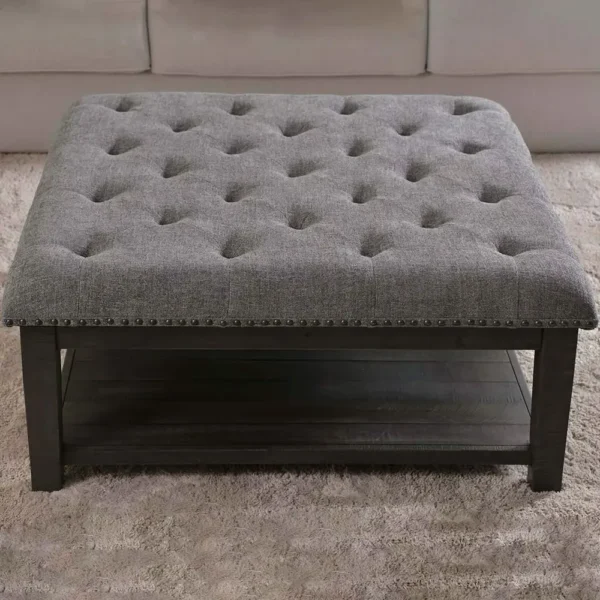 Versatile and functional, this oversized ottoman doubles as a coffee table. The grey jute upholstery is expertly tufted, while the dark wood base provides a sturdy lower shelf for books and decor, blending rustic charm with classic design.