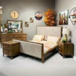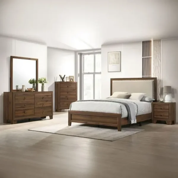 This comprehensive bedroom set features a warm light brown wood polish. The bed’s headboard is uniquely accented with a cream-colored jute fabric panel and nailhead trim, offering a classic look that brings warmth to any room.