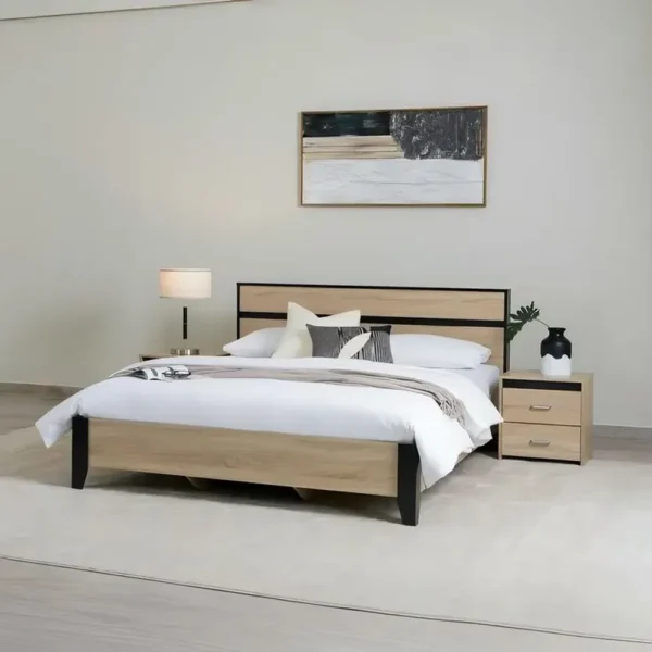 A perfect blend of classic wood tones and modern accents. This laminated bed set features a beautiful light brown grain finish framed by sharp black borders. The clean lines and minimalist headboard design offer a timeless look that fits any bedroom decor.