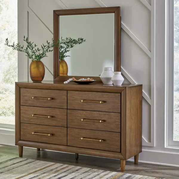 This dressing table combines classic warmth with modern hardware. The six-drawer chest is finished in a rich brown polish and accented by thin gold bar pulls for a touch of shine. The set is completed with a substantial matching mirror, perfect for a refined master bedroom.
