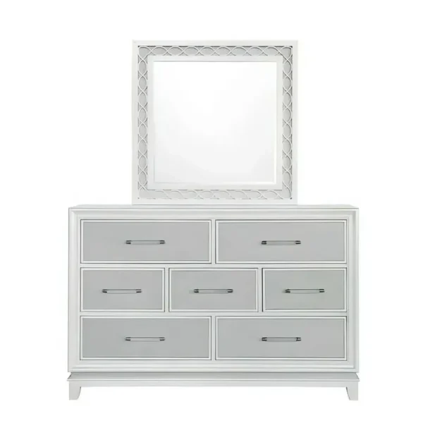 This classic deco bed set brings a bright and airy sophistication to your home. The headboard features plush grey velvet tufting framed by clean white lines and silver accents. The set includes a matching dresser, mirror, and chest, all showcasing a harmonious blend of traditional craftsmanship and modern color palettes.