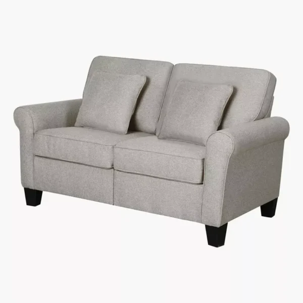 This classic two-seater sofa offers a timeless look with a rustic twist. Upholstered in a sturdy white jute fabric, it features traditional rolled arms and supportive back cushions. The black block feet provide a sharp contrast, making it a versatile piece for both traditional and transitional homes.