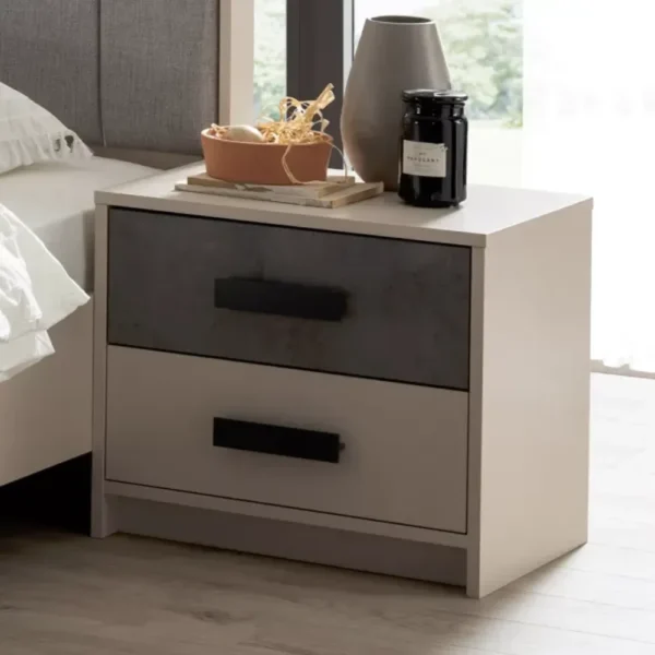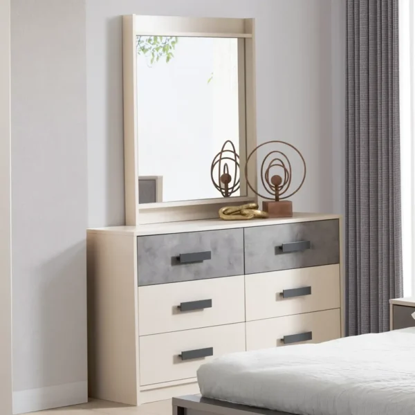 A perfect blend of texture and tone, this bed uses laminated panels in beige and grey to create a calming environment. The fabric headboard adds a soft touch, while the sleek metal base ensures structural longevity.