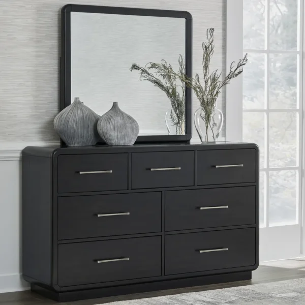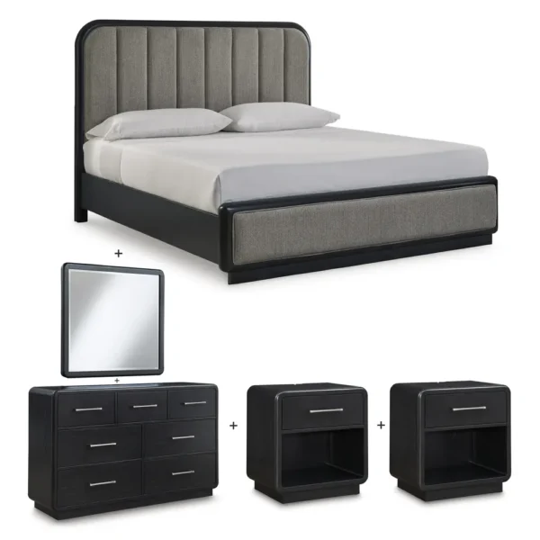 This modern Deco Bed offers a bold, sophisticated aesthetic with its deep black frame and contrasting grey fabric headboard. The headboard features elegant vertical channel tufting, adding texture and height to the room. Designed with rounded corners and a low-profile silhouette, this bed is paired with matching black nightstands and a spacious dresser to create a cohesive, high-fashion bedroom environment.