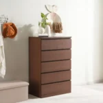 Organize your bedroom with this classic 6-drawer chest. Featuring a tiered layout with two small top drawers and four full-width bottom drawers, this unit is finished in a deep brown polish that highlights the wood grain. It’s a timeless storage piece for any modern home.